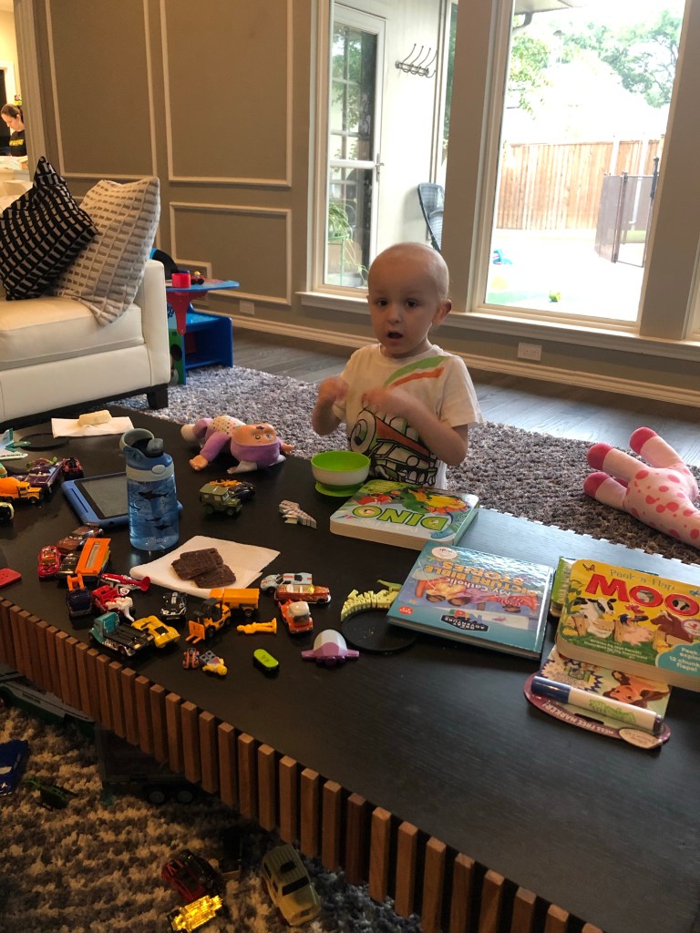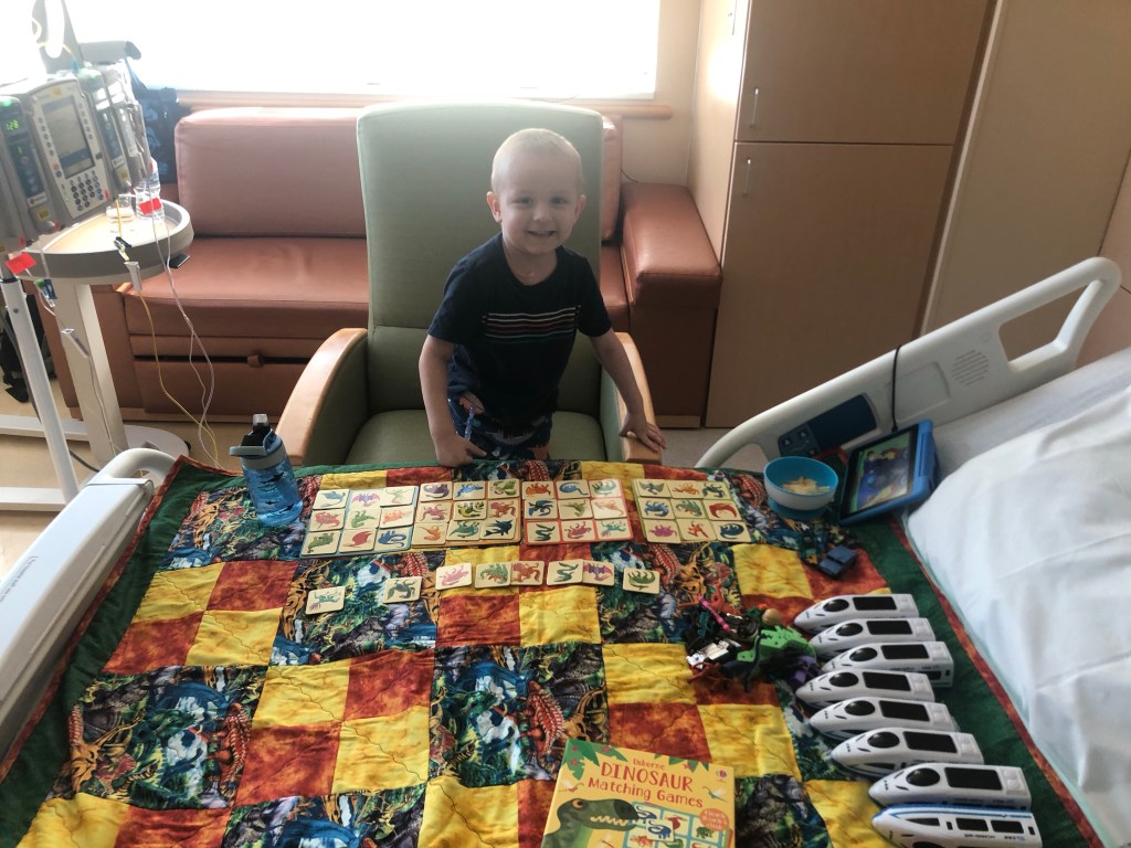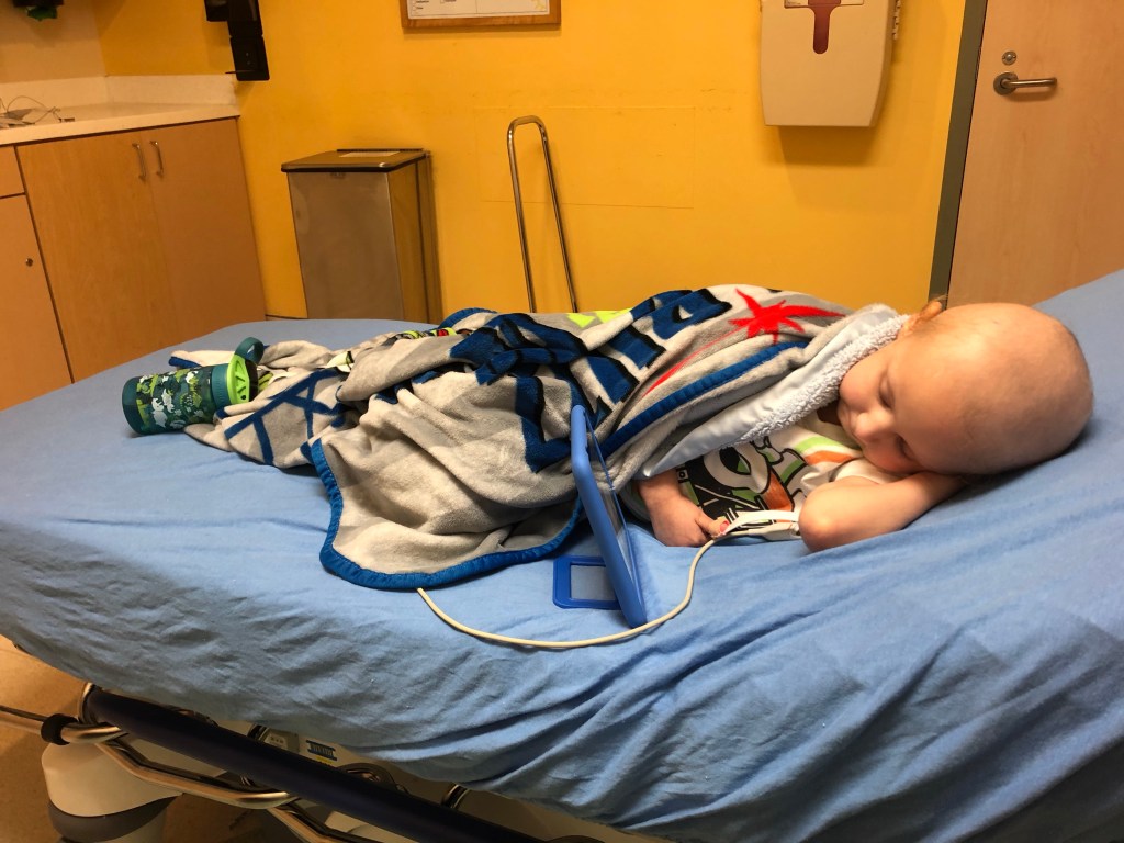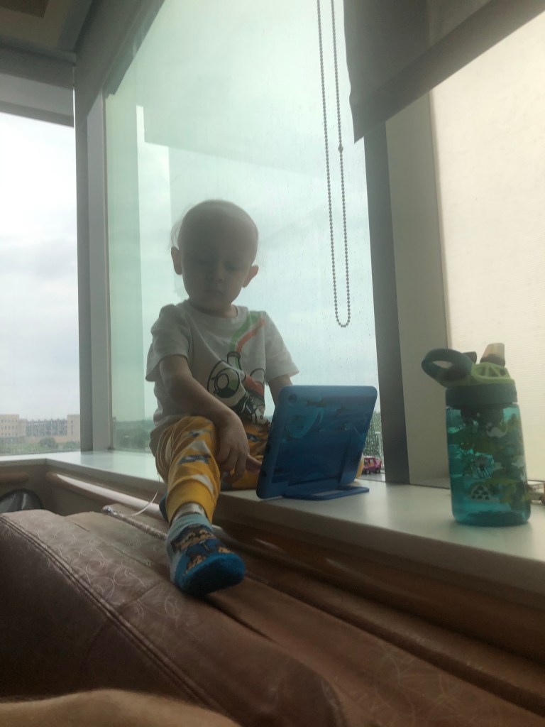 As we left off on our last post Cristian was doing fine with the treatments and was up playing around the room. We were fortunate that this high energy and generally good attitude continued as we got further along with the treatments. The plan was chemo for 24 hours, and introduce the “rescue” medicine at hour 42 to start help getting it out, then follow up doses every 6 hours until he clears. So far so good, on what is our last planned hospital admission to treat his leukemia.